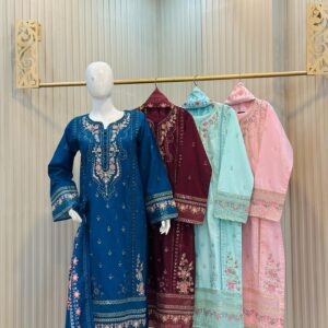 Introducing the Alif Pret Stitched Khaddar 3PC Dress, a perfect blend of tradition and elegance. This stunning ready-to-wear ensemble features a long-sleeved shirt and trousers crafted from comfortable Khaddar fabric, ideal for the autumn and winter seasons. The outfit is beautifully adorned with intricate embroidery on the neckline, sleeves, and hem. It comes complete with a matching dupatta featuring coordinated embroidery (visible on the displayed teal suit’s dupatta).